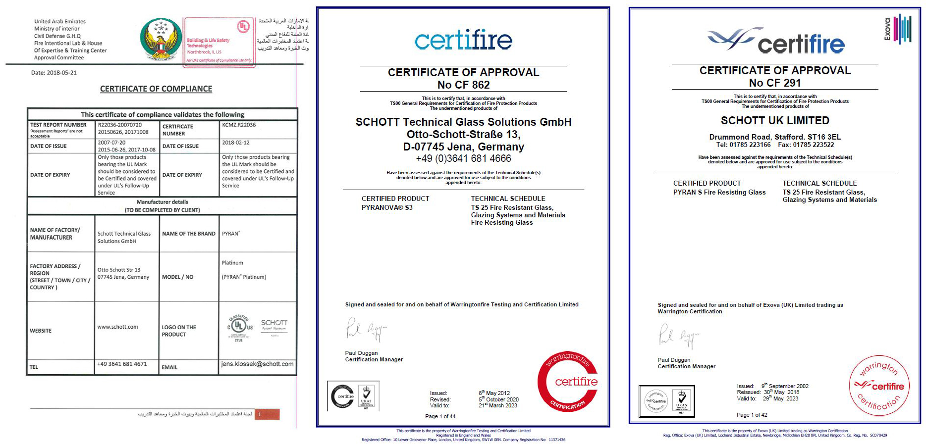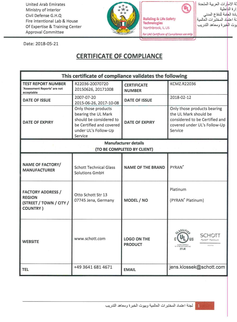 Emirates Glass and SCHOTT provide certified EN and UL multifunctional, laminated, and insulation fire resistant glass types with up to 120 minutes of barrier time