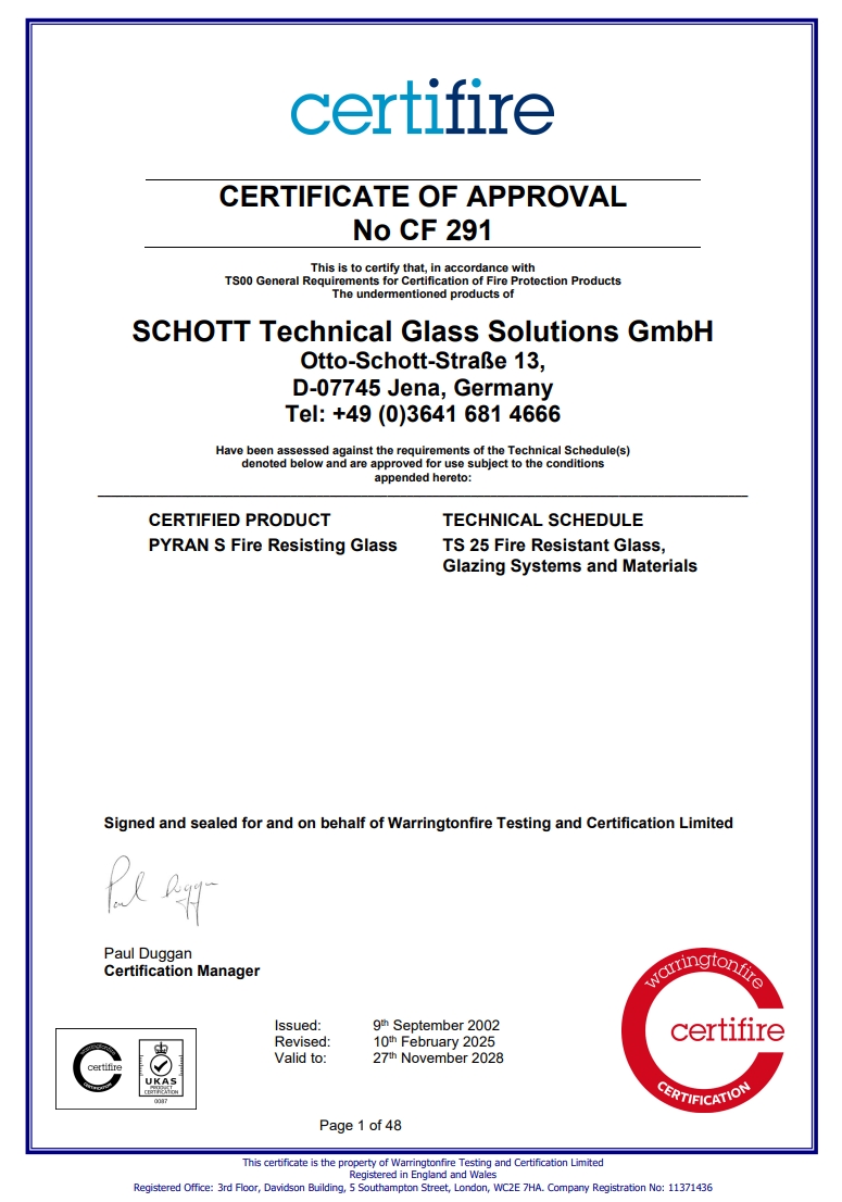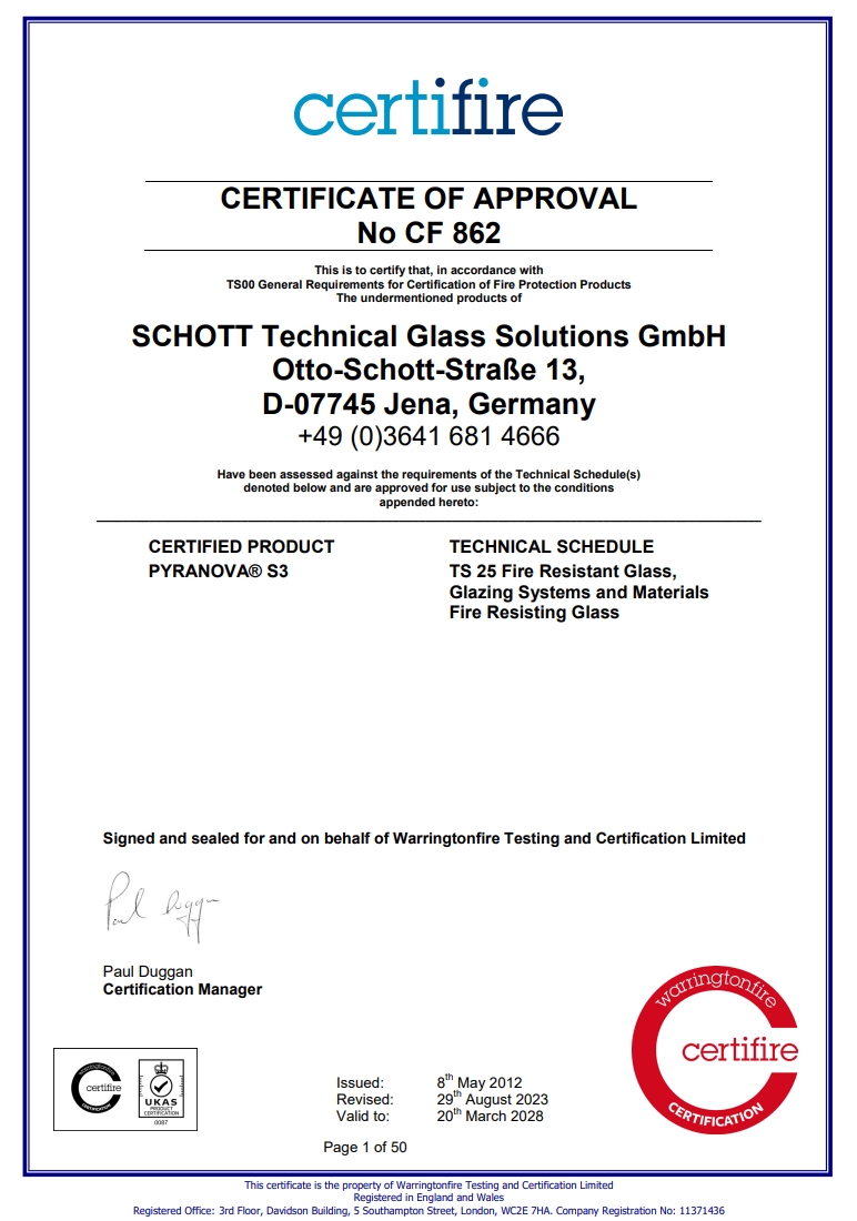PYRAN® Platinum is unique in the fire-rated glass industry. With dimensions of 1.1M X 1.954M it’s the world’s largest standard sheet size of UL-tested glass-ceramic, which opens up new opportunities for architects looking to create more inspirational building designs. Along with its impressive size and properties, PYRAN® Platinum strictly adheres to all safety standards. PYRAN® Platinum offers a compelling combination of high resistance to heat and thermal shock, alongside a clear, colorless appearance and smooth surface. Offering fire protection for up to 90 minutes in windows and 180 minutes in doors, the glass-ceramic also remains clear under intense thermal loads, giving a building’s occupants essential vision and time to exit a building in an emergency.